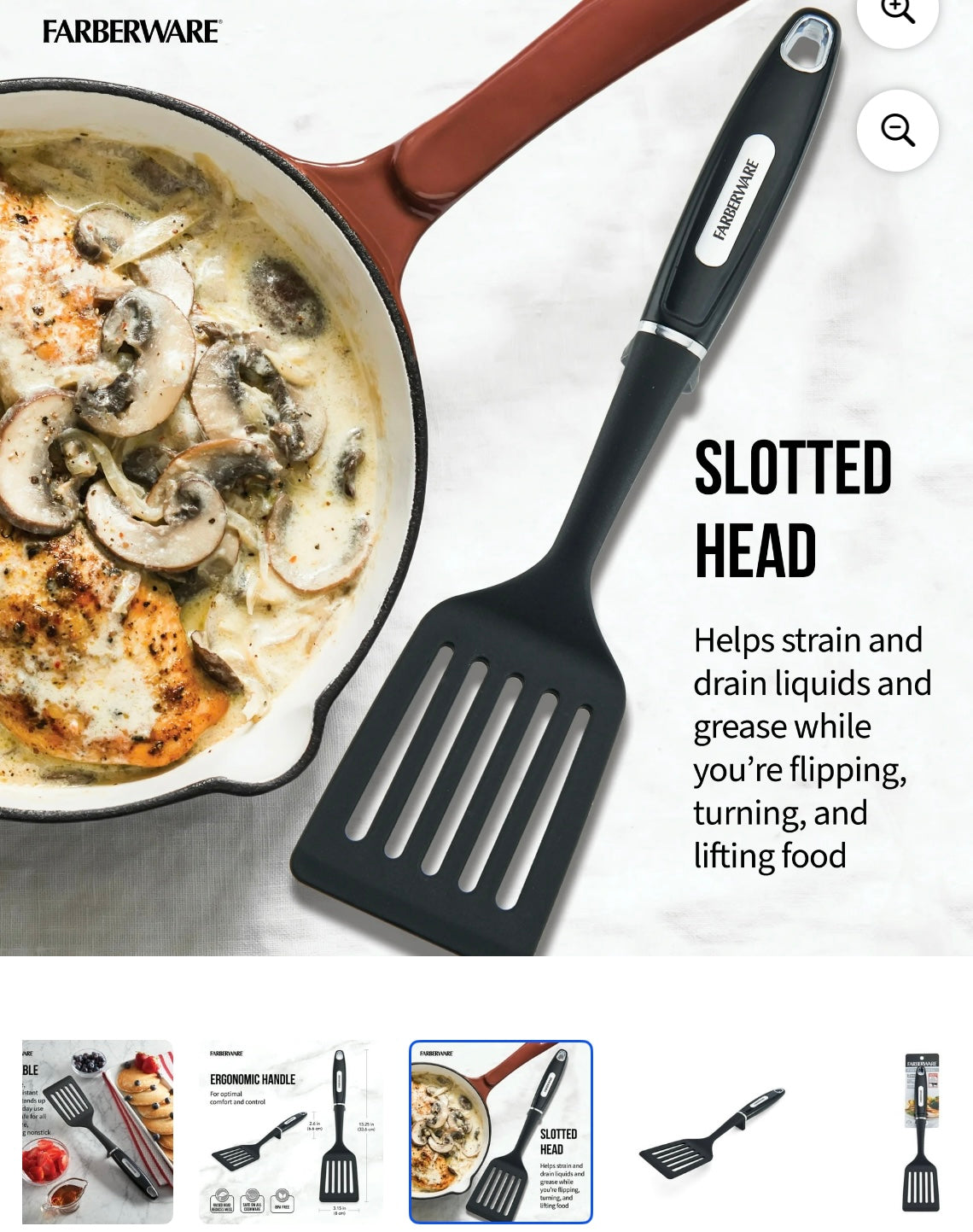 Flip, stir, sauté, and stir fry a variety of foods with the Professional Slotted Turner. The slotted head strains grease and other liquids from food while cooking, and is heat-resistant to 400°F. This versatile turner is made from durable nylon and is safe for use on all cookware, including nonstick. The tip-up feature raises the head when not in use to keep countertops clean. Dishwasher safe. Lifetime Limited Warranty.
